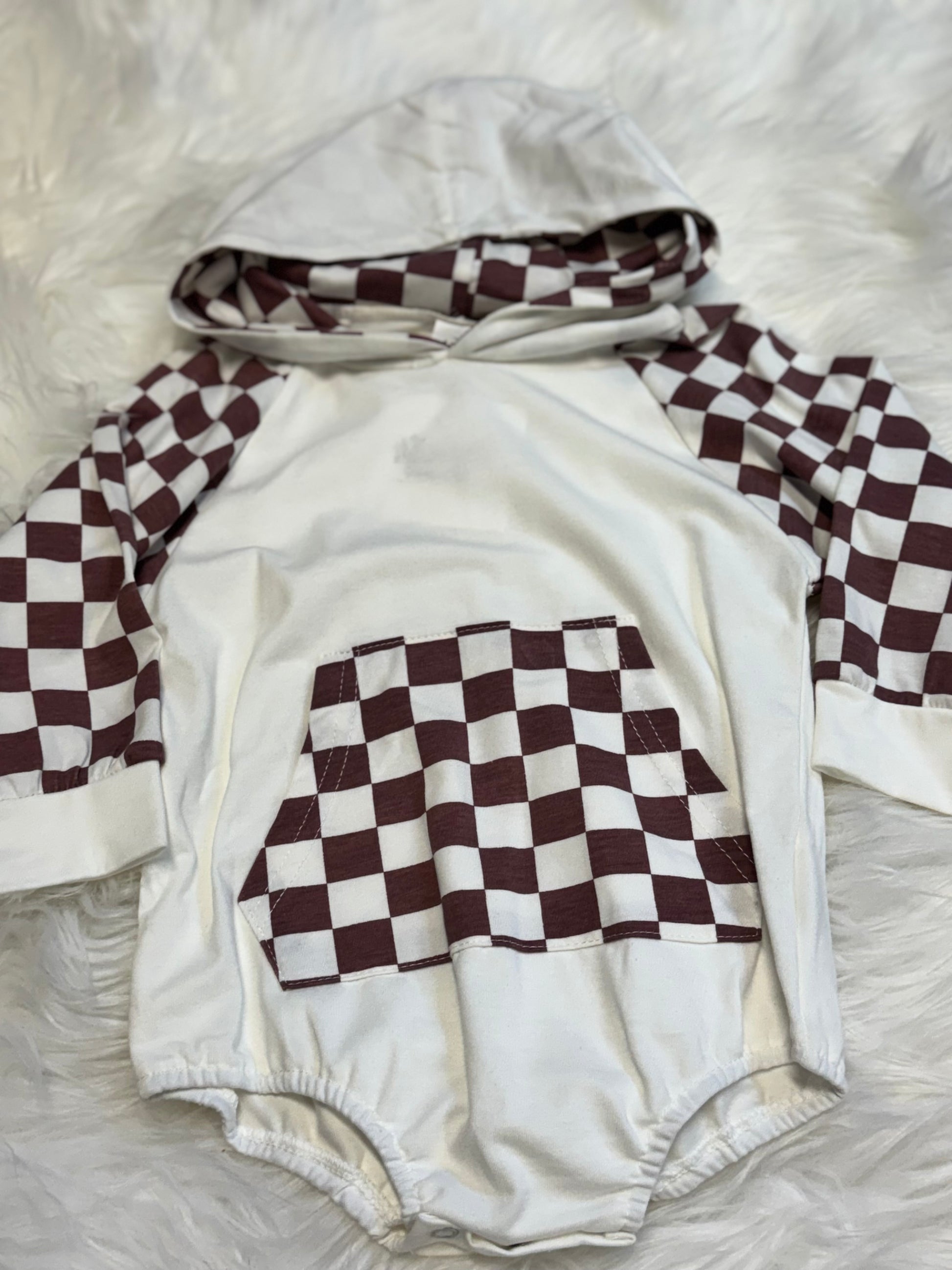 The Checkered Champ Hoodie Romper brings bold, comfy style to your little one's everyday adventures. With its cream base, chocolate-brown checkered accents, and cozy hood, this romper is equal parts trendy and practical. A front kangaroo pocket and easy snap closures make it as parent-friendly as it is cute.